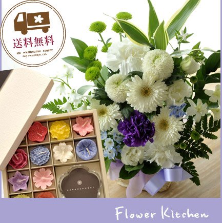 お供えセット 旬のおまかせお供えアレンジSサイズ カラーは白に青紫を入れて +【花づくし】12個のお花のキャンドルギフトセット
