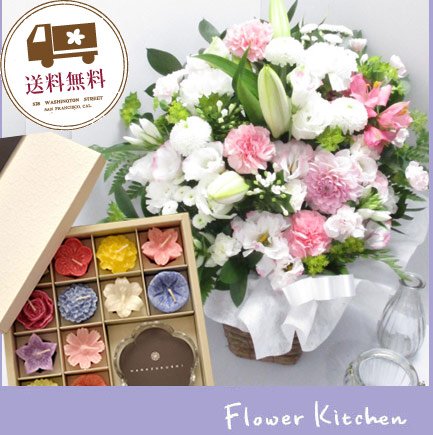 お供えセット 旬のおまかせお供えアレンジ12850円 カラーはおまかせミックス淡い色合い+【花づくし】12個のお花のキャンドルギフトセット