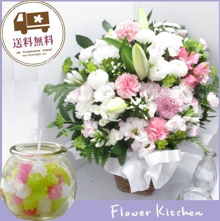 お供えセット 旬のおまかせお供えアレンジ12850円 カラーはおまかせミックス淡い色合い+「こんぺいとうキャンドル」スイーツキャンドル ギフトセット