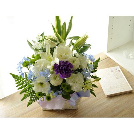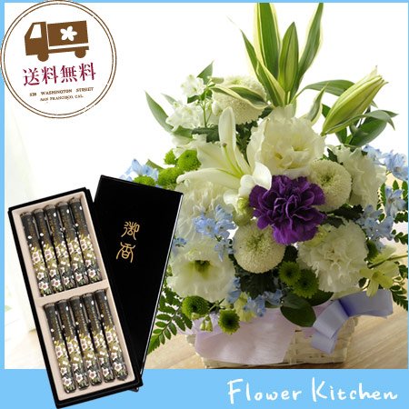 お供え線香セット ユリ供花アレンジ カラーは白に青紫を入れて +「特選淡墨の桜線香」黒塗箱セット