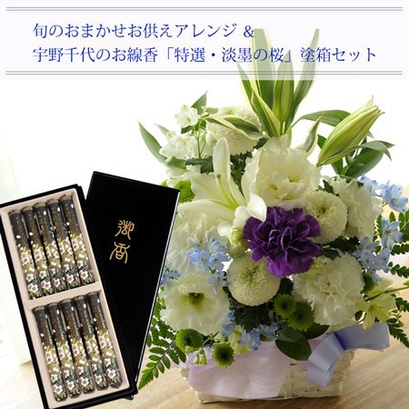【お供え花 お線香セット】 洋花の旬のおまかせ供花 お花カラーは白に青紫を入れて 【お線香 黒塗箱入り 日本香堂【特選 薄墨の桜】お線香ギフト】 「特選淡墨の桜」その奥深く上品な姿を想い創り上げた人気の宇野千代シリーズのお線香セット 短寸10本入り 線香の長さ:約14cm 塗箱入り