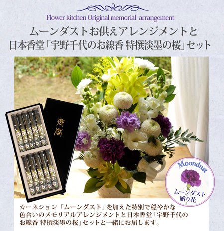 【お供え花 お線香セット】 洋花の旬のおまかせ供花 お花カラーはムーンダストお供えアレンジLサイズ 【お線香 黒塗箱入り 日本香堂【特選 薄墨の桜】お線香ギフト】 「特選淡墨の桜」その奥深く上品な姿を想い創り上げた人気の宇野千代シリーズのお線香セット 短寸10本入り 線香の長さ:約14cm 塗箱入り