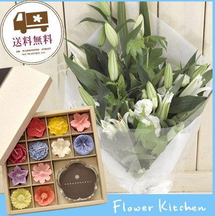 お供えセット ユリお供え花束 カラーは白のみ(グリーンが入ります)+【花づくし】12個のお花のキャンドルギフトセット