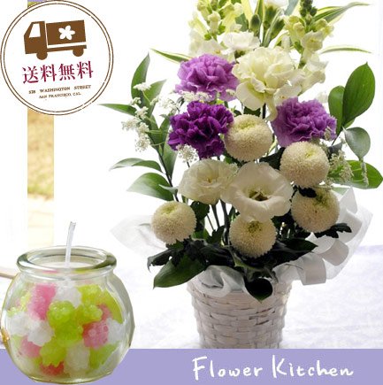 【お供え花&キャンドルセット】ムーンダストお供えアレンジMサイズ+「こんぺいとうキャンドル」スイーツキャンドル ギフトセット