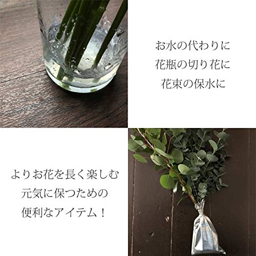 水を使用しない保水材です。バクテリアの繁殖を抑え、花持ちの継続とともに清潔な状態を保てます。花束を持ち歩く際の保水材としての利用のほか、お水の代わりに花瓶等に入れてもお使いいただけます。