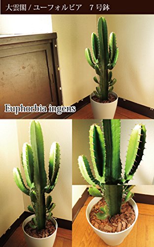 『大雲閣』 7号鉢/ユーフォルビア/ 個性的な独特なその樹形は男性にも人気が高いです。 モダンなインテリアや、おしゃれカフェ、ショップなどにも是非おすすめの植物です。 ◆◇大雲閣/ユーフォルビアって何??◆◇ サボテンと似ていますがサボテンではありません。 サボテンは葉が変形してトゲに変わりましたが、 ユーホルビアの仲間は茎が変化してトゲになっています。 世間ではサボテンイメージのインテリアとして多用されます。 大雲閣の育て方 □ 日当たり 室内の明るいところに置いて管理してください。 □ 水やり 土の表面が乾いてから、たっぷり与えてください。乾燥に強い植物です。冬場はさほど水やりは入りません。 大雲閣商品サイズ…7号鉢 高さ 70-80センチ 幅 15-20センチ