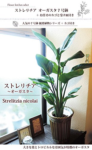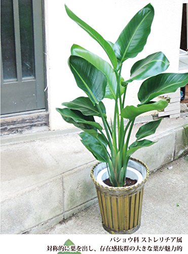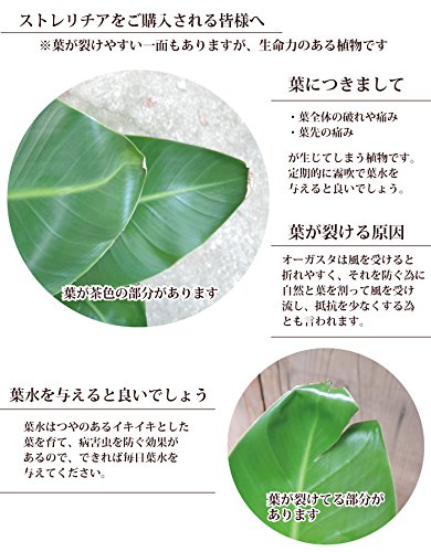 ストレリチア オーガスタ バショウ科ストレリチア属 ■商品サイズ…ストレリチアオーガスタ 全体高さ約70センチ~90センチ 幅約40センチ~50センチ 南国のバナナの葉のような形が特徴的 定番人気のストレリチア 大きなバナナのような葉の形をしていて、リゾート地でも多用されている観葉植物。 トロピカルな雰囲気があります。 上へ上へと伸びて横に広がらないので、スペースロスにならず管理も楽です。 ※植物なので葉が傷ついていたり、裂けている部分が生じます。 原因として、大きな葉で風を受けると折れやすく風を受け流す為に自然に割れが生じてしまいます。 品質には問題ございませんので、ご了承ください。