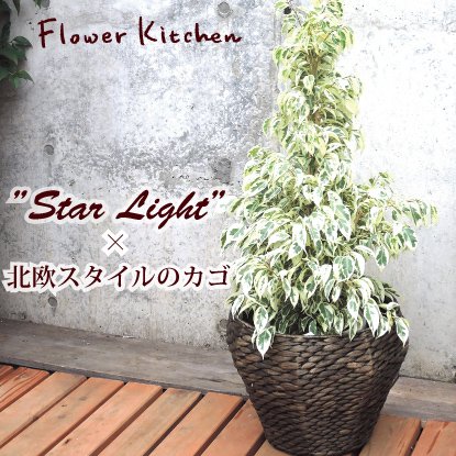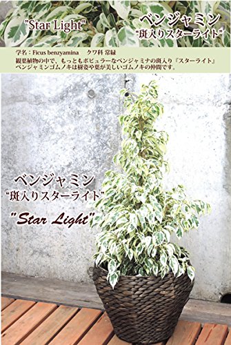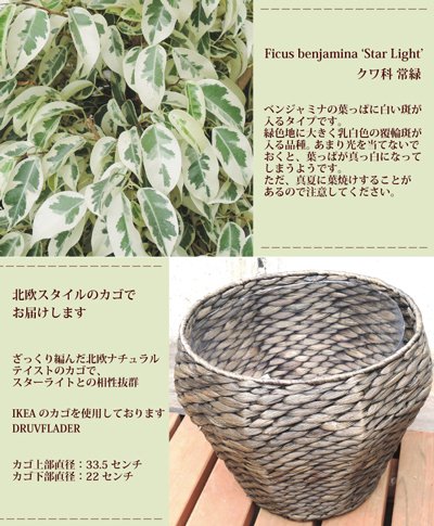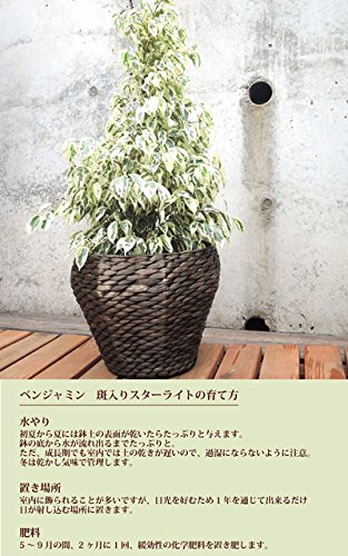 ◇ベンジャミンスターライトの育て方◇ 【置き場所】室内に飾られることが多いですが、日光を好むため1年を通じてできるだけ日が差し込む場所に置きます。 【水やり】初夏から夏には鉢土の表面が乾いたらたっぷりと与えます。鉢のそこから流れ出るまでたっぷりと。ただ、成長期でも室内では土の乾きが遅いので、過湿にならないように注意。冬は乾かし儀未で管理します。 【肥料】 5~9月の間、2ヶ月に一度、緩効性の化成肥料を置き肥します ■商品サイズ…ベンジャミン スターライト 全体高さ:約80-90センチ 全体幅:約25-35センチ IKEAの北欧スタイルのカゴでお届けします DRUVFLADER カゴ上部直径:33.5センチ カゴ下部直径:22センチ