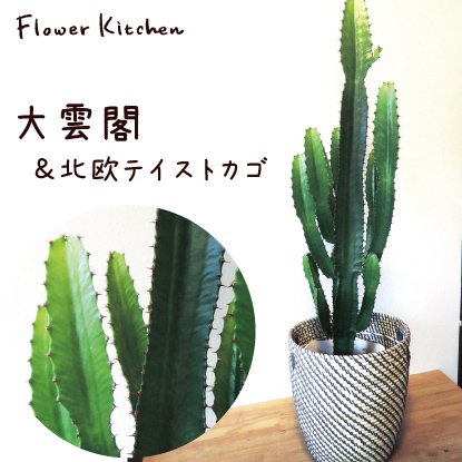 『大雲閣』 7号鉢/ユーフォルビア/ 個性的な独特なその樹形は男性にも人気が高いです。 モダンなインテリアや、おしゃれカフェ、ショップなどにも是非おすすめの植物です。 ◆◇大雲閣/ユーフォルビアって何??◆◇ サボテンと似ていますがサボテンではありません。 サボテンは葉が変形してトゲに変わりましたが、 ユーホルビアの仲間は茎が変化してトゲになっています。 世間ではサボテンイメージのインテリアとして多用されます。 大雲閣の育て方 □ 日当たり 室内の明るいところに置いて管理してください。 □ 水やり 土の表面が乾いてから、たっぷり与えてください。乾燥に強い植物です。冬場はさほど水やりは入りません。 大雲閣■商品サイズ…7号鉢 高さ 70-80センチ 幅 15-20センチ IKEAのカゴを使用しております RAGKORN 80213776
