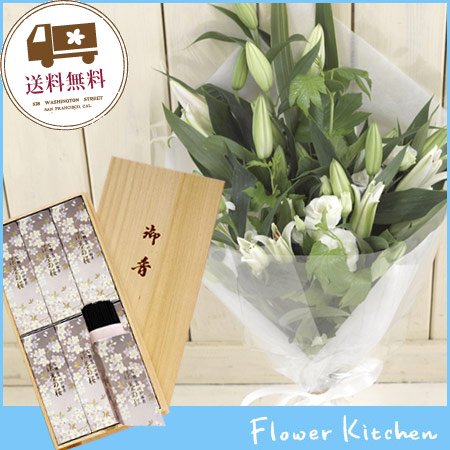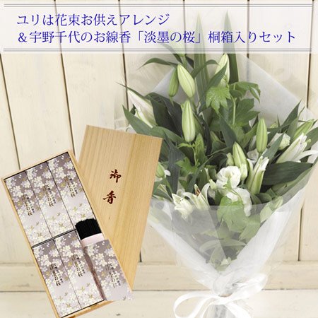 お供え線香セット ユリのお供え花束 白のみ(グリーンが入ります) +桐箱入り淡墨の桜