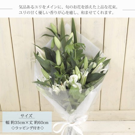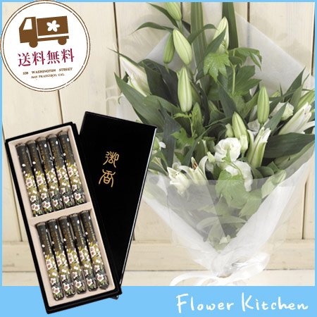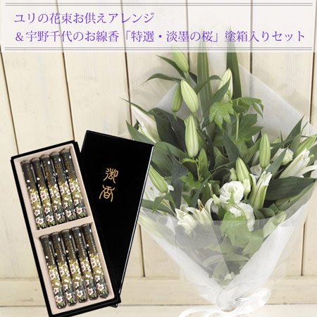 お供え線香セット ユリお供え花束 カラーは白のみ(グリーンが入ります) +「特選淡墨の桜線香」黒塗箱セット