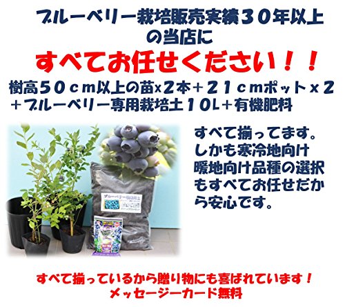 [初心者おすすめ]プロにお任せブルーベリー苗木栽培6点セット(13.5cmポット樹高0.5m前後の苗x2+ブルーベリー専用土+21cmポット+肥料)