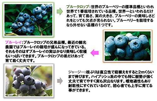- 今回はハイブッシュ系ブルーベリーのおすすめ3品種をご用意しました。3品種のブルーベリーを近くに植えることでお互いに受粉しあい、より一層ブルーベリーの実つきがよくなります。ハイブッシュ系ブルーベリーの実は大粒で甘く皮が柔らかいので格別に美味しく一度食べたら病みつきになります。北陸、関東8県と関東以北の比較的寒い地域に向いていますが、半日蔭ならば暖かい地域でも栽培可能です。当店も静岡県ですが元気に育ってます!栽培方法は同封の栽培説明書をご覧ください