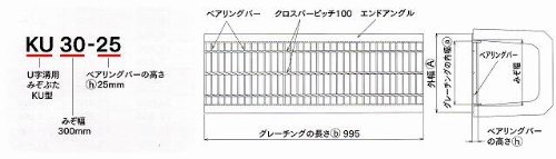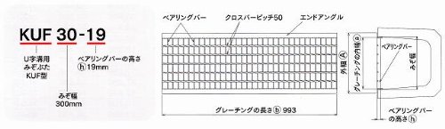 - カタオカグレーチングU字側溝180mm用 普通目(並目) 滑り止め付 適用荷重 歩道用 形式記号 KUF-X18-19寸法(mm) 内幅幅 a×外幅A×長さb×高さh 170×224×993x19 重量 5.9kg 溶融亜鉛メッキ製。このグレーチングに適合するサウンドルースはL30×30×3になります。