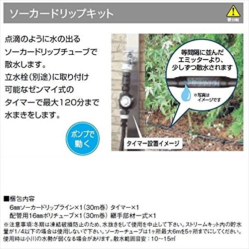 ●点滴のように水の出るソーカードリップチューブで散水します。立水栓(別途オプション)に取り付け可能なゼンマイ式のタイマーで最大120分まで水撒きをします。