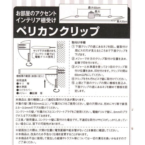 - 注意:耐荷重はコンクリート壁に取付けた場合です。不適切な取付けやビスがしっかりしまっていない場合には、落下する可能性があります。