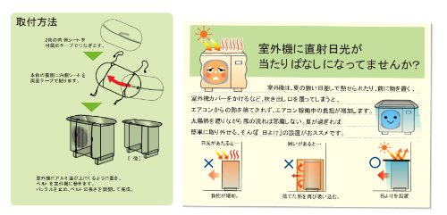 ●【取り付け手順】①2枚の内側シートを付属のテープで止める。②本体の裏側に内側シートをテープで貼る。③室外機にベルトで巻いて装着!