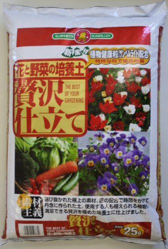 極上堆肥・極上赤玉土・極上鹿沼土を中心に贅沢な素材を贅沢に配合しました。肥料成分がバランス良く含まれており、長期間肥料が効き続ける贅沢な培養土です。酸度・肥料成分調整済み。植物に有害な産廃堆肥・汚泥などは一切使用しておりません。使用する人も植えられる植物も満足できる贅沢を極めた培養土です。