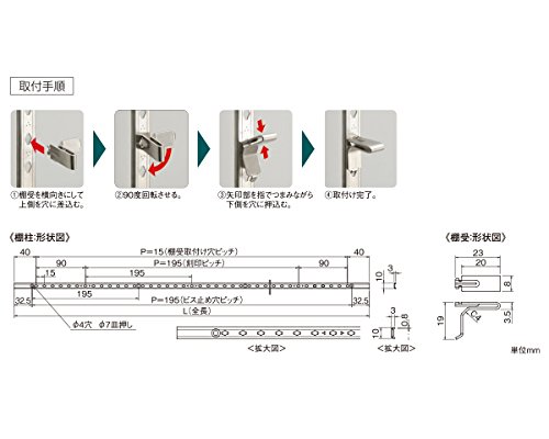 - 材質:棚柱:SUS430 板厚:0.8mm ホワイト焼付塗装 / 棚受:SUS304 板厚:1.0mm ホワイト焼付塗装 / ビス:SUS430皿木φ3.1×L32(頭部ホワイト塗装)