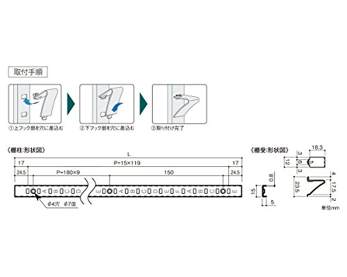 - 材質:棚柱:SUS430 板厚:0.8mm No.4仕上 / 棚受:SUS304 板厚:0.8mm ヘアライン仕上 / ビス:SUS430皿木φ3.1×L32