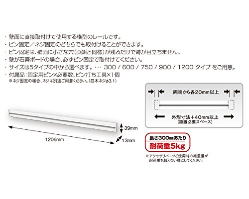 ●壁面に直接取付けて使用する横型のレールです。●壁が石膏ボード12.5mmだけの場合、必ずピン固定で取付けて下さい。●耐荷重5Kg。【注意事項】●取付けの際は、両端共20mm以上のスペースをあけるようにして下さい。スペースが20mmない場合、エンドキャップが入りません。●必ず他のアイテムとの組合せ荷重を確認して下さい。