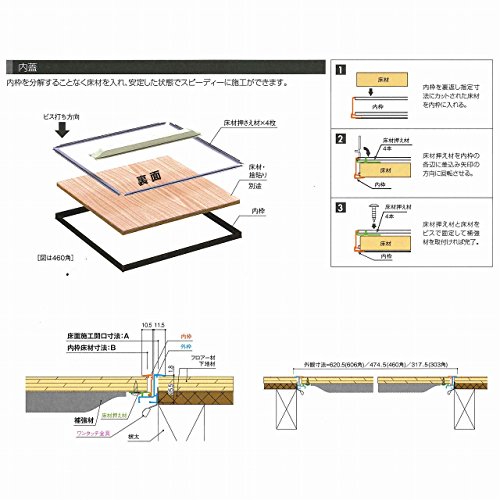 ●外枠・内枠のコーナーは樹脂ですので、従来品より引っかかりにくい構造です。その他に、内枠施工方法・回転取っ手の施工を一新し、容易に安定した施工を可能にしました。【注意事項】●本製品は屋内用です。●内枠15mm厚までの床材用です。●15mm厚未満の床材は、15mmになるよう捨て貼り等で調整してください。