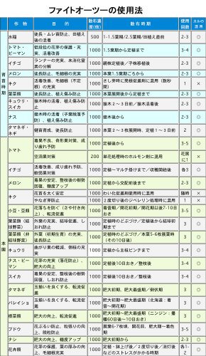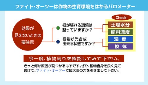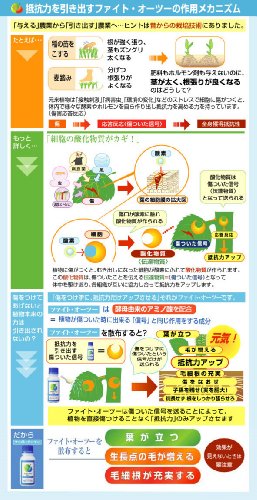 - 作用:4つの天然成分が植物に直接働きかけ、植物本来の力を活性化植物ホルモンや抵抗力誘導物質の発生を促します。さらにオリゴ糖を配合したことで、有効成分の植物体内への吸収力がアップ。葉中糖度も向上します。