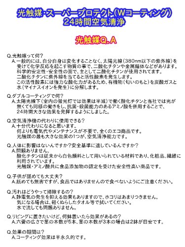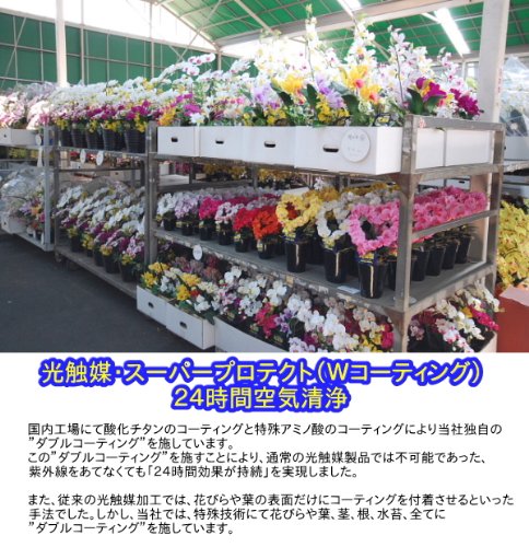 当店のアートフラワーは、究極のリアリティを追求し、美しい造形とみずみずしい質感を持たせました。小さいサイズから大きいサイズまで取り揃えており、お誕生日やご入学、ご結婚のお祝いや開店のお祝い、お見舞い、会社の受付など幅広くご利用いただけます。国内工場にて酸化チタンのコーティングと特殊アミノ酸のコーティングにより当社独自の”ダブルコーティング”を施しています。この”ダブルコーティング”を施すことにより、通常の光触媒製品では不可能であった、紫外線をあてなくても「24時間効果が持続」を実現しました。また、従来の光触媒加工では、花びらや葉の表面だけにコーティングを付着させるといった手法でした。しかし、当社では、特殊技術にて花びらや葉、茎、根、水苔、全てに”ダブルコーティング”を施しています。