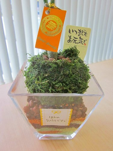 ペットボトルを微末粉砕したカラーサンドの上に苔玉を乗せた、とてもエコロジーな商品です。土を使用していないので、害虫が発生しません。水が無くなったら少し入れるという事を基本にすれば、本当に手間がかからず簡単で衛生的です。清潔なので食卓やお部屋、オフィスのデスクに、かわいいグリーンをどうぞ