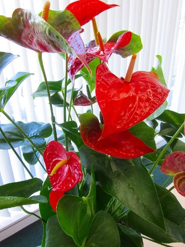 四季咲きで花持ちが良く涼しげでギフトとして大変喜ばれている人気商品です。当店のアンスリウムは、大変大きく高さもありお部屋のインテリアとして置いて頂くと一段と華やかになります。花は、大きいものになると20cm程の大きさになっているものもあります。アンスリウムのハート型の独特な花は、和室にも洋室にも合います。アンスリウムの花言葉は「飾らない美しさ」「無垢な心」「情熱」です。