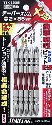 ●テーパートーション部が左右の回転トルクを吸収することにより衝撃を緩和し、耐久性がUP。ビットの寿命が大幅に向上しました。先端はスリムでネジ頭が見やすく、回転時のカムアウト(ビットの浮き上がり)を軽減する作りになっています。●パッケージサイズ/縦:155mm横:65mm高さ:8mm●パッケージ重量:86g●呼び寸法:+2×85●入り数:5本組●ビット:磁力付●14.4V充電ドライバー対応