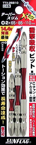 ●テーパートーション部が左右の回転トルクを吸収することにより衝撃を緩和し、耐久性がUP。ビットの寿命が大幅に向上しました。先端はスリムでネジ頭が見やすく、回転時のカムアウト(ビットの浮き上がり)を軽減する作りになっています。●パッケージサイズ/縦:155mm横:40mm高さ:8mm●パッケージ重量:54g●呼び寸法:+2×65、85、110mm(各1本)●入り数:3本組(アソート)●ビット:磁力付●14.4V充電ドライバー対応