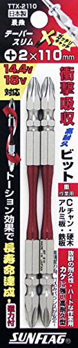 ●テーパートーション部が左右の回転トルクを吸収することにより衝撃を緩和し、耐久性がUP。ビットの寿命が大幅に向上しました。先端はスリムでネジ頭が見やすく、回転時のカムアウト(ビットの浮き上がり)を軽減する作りになっています。●パッケージサイズ/縦:155mm横:35mm高さ:8mm●パッケージ重量:70g●呼び寸法:+2×110●入り数:2本組●ビット:磁力付●14.4V充電ドライバー対応