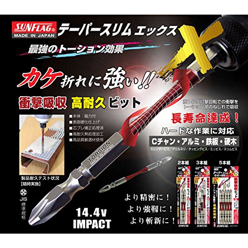 ●テーパートーション部が左右の回転トルクを吸収することにより衝撃を緩和し、耐久性がUP。ビットの寿命が大幅に向上しました。先端はスリムでネジ頭が見やすく、回転時のカムアウト(ビットの浮き上がり)を軽減する作りになっています