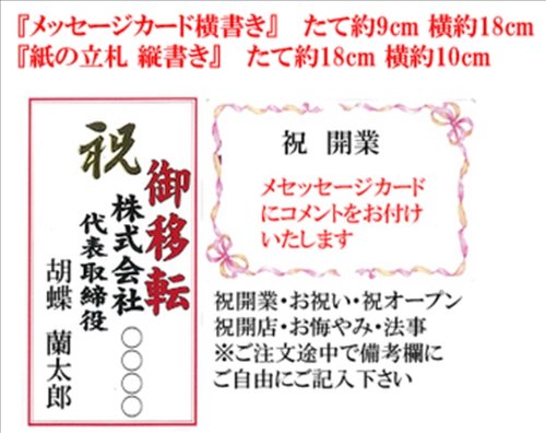 - ◎メッセージカード付けられます。商品をカートに入れた後商品の下の「ギフト設定」にチェックを入れて下さい。「レジに進む」→「お届け先住所の選択」→ギフトの設定をして下さいのページで「ギフトメッセージを入れる」にチェックを入れてご記入して下さい。横書き たて約9cm 横約18cm。紙の立札 縦書き たて約18cm 横約10cm