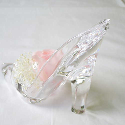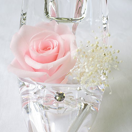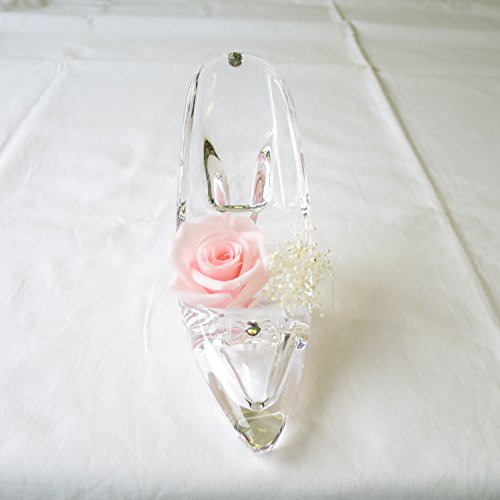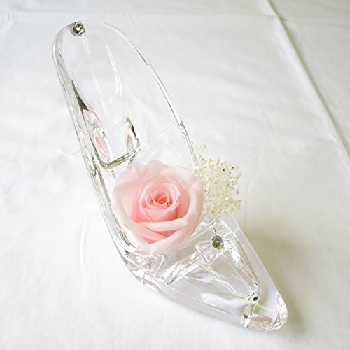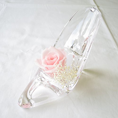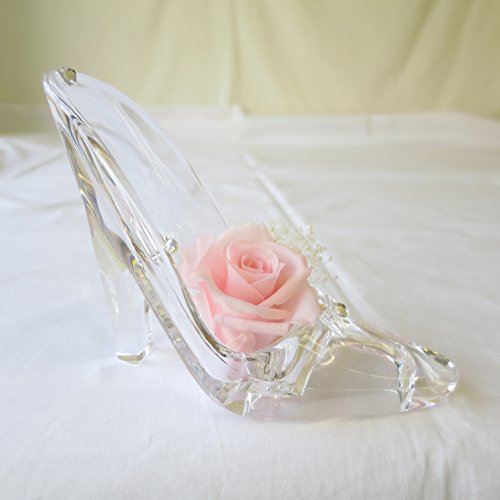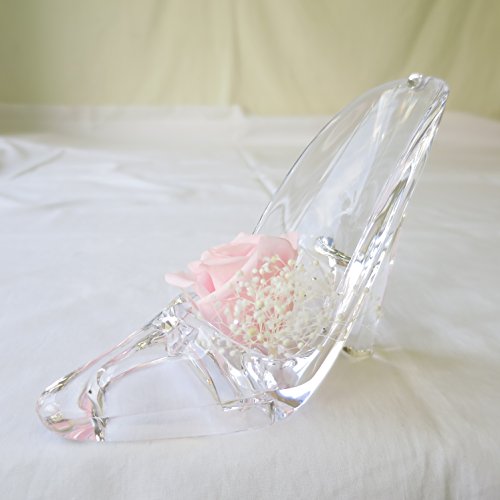 - シンデレラの靴1個、大きさは、長さ12cm 高さ10cm 女性の手のひらにのるくらいの可愛いサイズです。 シンデレラの靴をモチーフにしたアクリル製の透明感のある靴です長期間保存のできる生花を加工したプリザーブドフラワーのバラとかすみ草、クリスタルな輝きを3か所アレンジしています