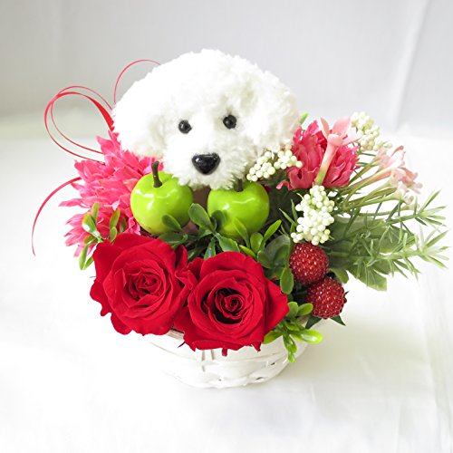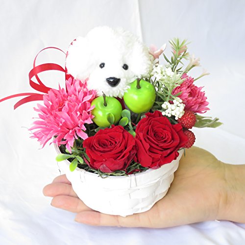 誕生日 プレゼント 女性 お花のプレゼント。なんといって人気のトイプードル。プリザーブドフラワーの薔薇と造花のアレンジメント。バラは高級なプリザーブドフラワー。普通の生花なら数日で枯れてしまいますがプリザーブドフラワーは人体に無害なオーガニック色素をお花に吸い上げさせて加工し、みずみずしい姿を数年にわたり変わらない状態を保ってくれるお花です。※サンモクスイの造花は100均で販売されてるものとは違います。「生花」よりも高価な、驚くほどのクオリティーの高級素材を使用しています。※写真はイメージです。手作りの為一部、お花の形状や色が違う場合があります。トイプードル(高さ約8cm)。ホコリも安心のクリアケース入り。もちろん取り出して飾ることもできます。クリスマスプレゼント、ホワイトデーお返し、母の日ギフト、敬老の日プレゼント、誕生日プレゼントなど各種お祝い、ギフトに最適です。 クリスマスプレゼント クリスマス プレゼント