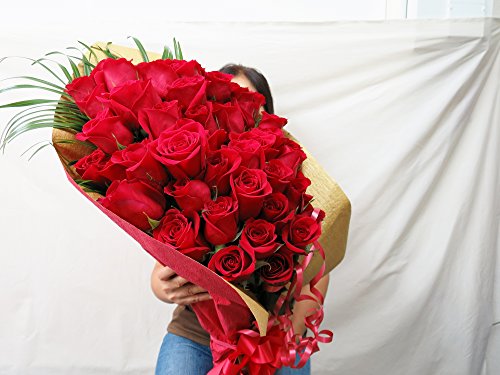 - ◎宅配便には箱のサイズ制限があります。可能な最大の箱でお届けしますが、長さが同じ大輪のバラで70本花束は作れない為段差をつけて花束に仕上げます。