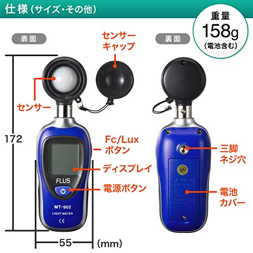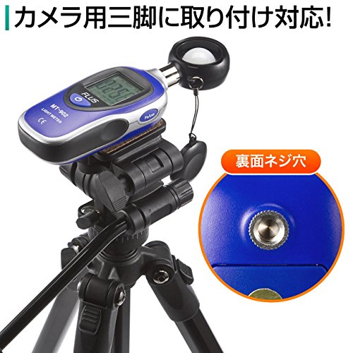 - 便利な電池残量表示機能付です。カメラ用三脚に取り付け対応で、本体裏面のネジ穴(ネジサイズ:1/4-20UNC)にカメラ用三脚を取り付けて安定した測定を行うことも可能です。