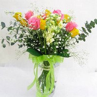 - カラフルなバラの花に季節の草花をミックして花束にしラッピングしてお届けします。お花のお色や草花の種類はスタッフにおまかせになります。お祝いやお礼に!届けた方の笑顔が嬉しいバラと季節の花束をどうぞ。