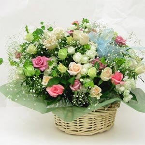 - こちらは品種のご指定は承っておりません。数種類の白系、ピンク系のスプレーバラやミニバラをミックスしてお作りします。お色は濃いピンクから明るいピンクまでです。グリーンは季節のものをお入れします。リボンのお色は変わる場合があります。バラのアレンジをしてあるバスケットには給水性スポンジ(オアシス)をいれあります。お花の本数が多いと乾燥しますので、吸水性スポンジにお水を毎日少し足しますとお花が長持ちします。