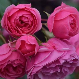 濃桃色のディープカップのころころと丸い蕾は、10~15輪の房になります。その花形は丸弁抱咲きで大変可愛らしく、ノスタルジックな雰囲気のバラです。葉は深い緑の照葉も花を引き立てます。繰り返し咲く性質もよく、アーチやポールなどいろいろに仕立てて楽しめます。わずかですが、リンゴのようなさわやかな香りがします。黒点病に強い強健品種です。2006年ADR受賞。