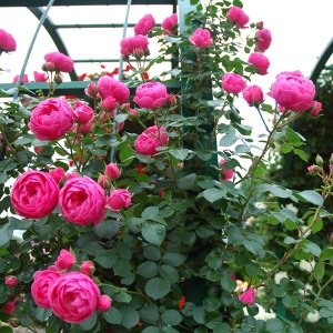 - 濃桃色のディープカップのころころと丸い蕾は、10~15輪の房になります。その花形は丸弁抱咲きで大変可愛らしく、ノスタルジックな雰囲気のバラです。葉は深い緑の照葉も花を引き立てます。繰り返し咲く性質もよく、アーチやポールなどいろいろに仕立てて楽しめます。わずかですが、リンゴのようなさわやかな香りがします。黒点病に強い強健品種です。2006年ADR受賞。