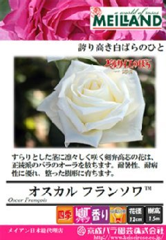 清らかに澄み切った白の大輪花は、フランス革命の時代を情熱的に生きた男装の麗人オスカル・フランソワ・ド・ジャルジェの面影そのものです。 すらりとした茎に凛々しく咲く剣弁高芯の花は、正統派のバラのオーラを放ちます。また、見た目だけでなく、芳香まで備えています。 花首の長さ、葉、茎のバランスが良く、整った樹形に育ちます。耐暑性、耐病性にすぐれる稀少な白バラ大輪品種として、お庭の中でも特別な存在感を示してくれることでしょう。 2003年ローマ国際コンクールHT部門金賞、同芳香部門金賞、同ジャーナリスト部門金賞受賞。