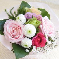 - 春色のバラで3~5色でお届けします。お色は優しいパステル調の黄色・ピンク・オレンジ・白など主体になります。またバラは大輪系からめずらしいスプレーバラまで入る場合もございます