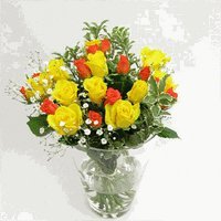 - オレンジと黄色系のバラにカスミソウと季節のグリーンをあしらい、ラッピングしてお届けします。お見舞いに元気の出るオレンジと黄色のバラを贈りませんか。こちらは品種のご指定は承っておりません。数種類のオレンジ系、黄色系のバラをミックスでお作りする場合もございます。お色は濃いオレンジから明るい黄色まででお作りします。