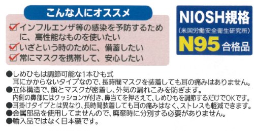 携帯しやすいコンパクトな名刺サイズ! 小分けにすると、かばんやポケットにすっぽり。 立体構造で、内側の鼻部にはクッションが付いているので、顔とマスクが密着し、外気の漏れこみを防ぎます。 アジャスター付きで、しめひもの長さが調節できます。 Λ(ラムダ)形になった保形テープが立体構造をしっかりキープ。