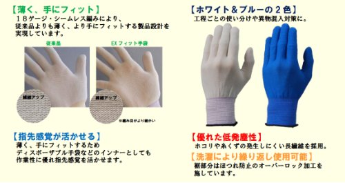 薄く指先感覚の活かせる、18ゲージ・シームレス編み手袋。使い捨て手袋の内履き用に便利です。色を変えて異物混入対策にも。
