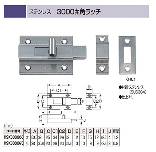 用途:今付いてるドアに 複数個の錠を付ける事で侵入を遅らせます!。 商品名:補助 防犯錠 ステンレス 3000#角ラッチ 小サイズ 型番:HSK3000070 色:ステン ヘアーライン色 のみです。 本体:ステンレス 付属品:ありません。 特徴:丈夫です。 その他:サイズ38ミリです。