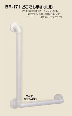 4色(アイボリー、ブラウン、シルバー、ブロンズ)から 選んでください。 用途:浴室の出入り口、トイレに、廊下に、玄関にも使用できる抗菌処理してある手すりです。 商品名:トイレ・浴室用手すりL型600ミリ*400ミリ*32ミリ(アルミ製) 型番:BR-171 色:アイボリー、ブラウン、シルバー、ブロンズ色 より 指定してください。 サイズ:長さ600ミリ*400ミリ 直径32ミリ 材質:アルミ抗菌樹脂コーティング+樹脂・抗菌アルマイト+樹脂 特徴:握り部は抗菌アルマイト・抗菌樹脂コーティング仕上げです 付属品:木ネジ(A4×30)・ナイロンプラグ(6×30)付きユニットバスの場合は専用ナットを別売りしています
